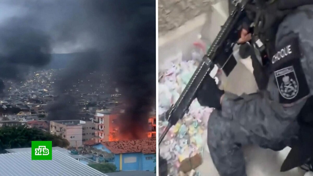 [ Смотреть видео на сайте НТВ ] Бразильский город Рио-де-Жанейро стал ареной кровавой битвы между полицейскими и боевиками наркомафии. На улицах слышны выстрелы, гремят взрывы. Несколько зданий охвачены огнем. Все началось с того, что Министерство внутренних дел Бразилии решило провести спецоперацию против «Красной команды». Так называется одна из самых многочисленных и влиятельных преступных группировок. В рейд отправились 2,5 тыс. полицейских. Им удалось провести несколько удачных облав и арестов, но затем боевики опомнились и дали отпор стражам порядка. Бандиты используют автоматическое оружие и беспилотники. С их помощью на полицейских сбрасывают самодельные бомбы. По последним данным, в перестрелках уже погибли 64 человека, а некоторые местные СМИ сообщают о 80 жертвах, включая гражданских и полицейских. Операция продолжается. [ Смотреть видео на сайте НТВ ]