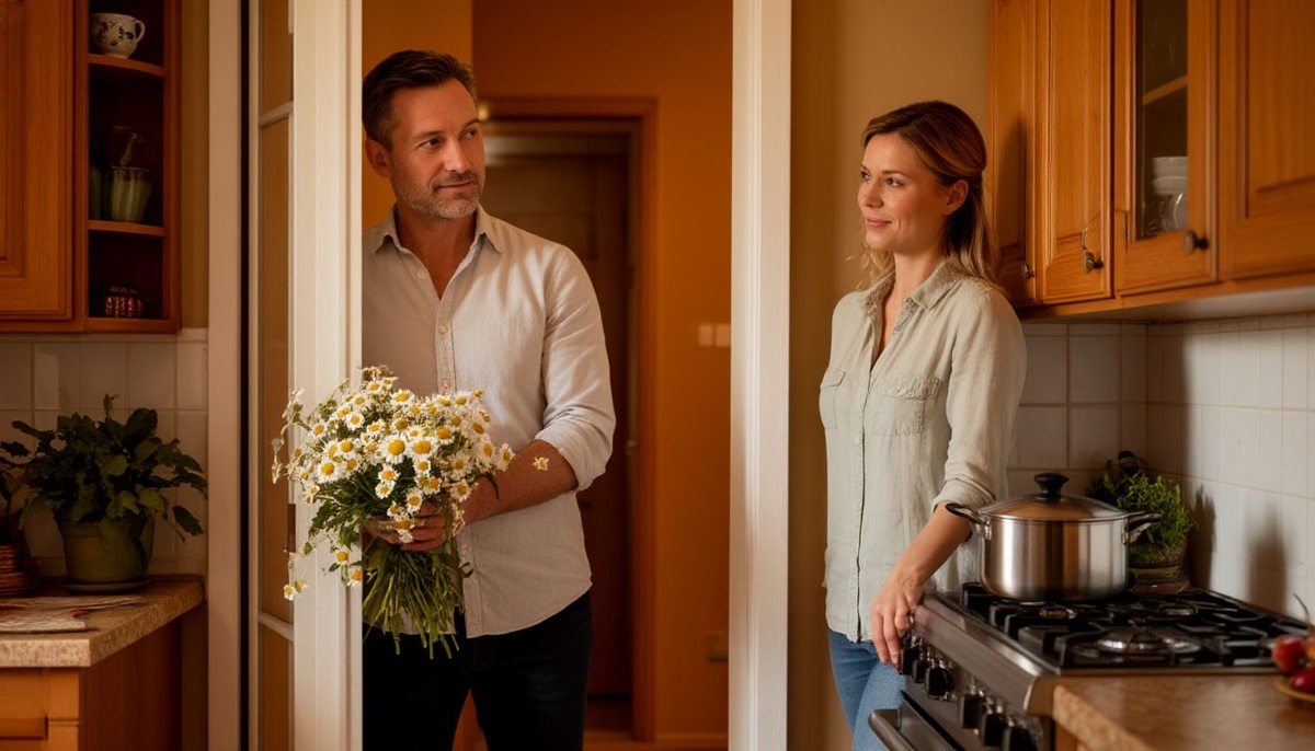 На следующий день ровно в семь раздался звонок в дверь. Я открыла. На пороге стоял Вадим — в чистой рубашке, с букетом ромашек.