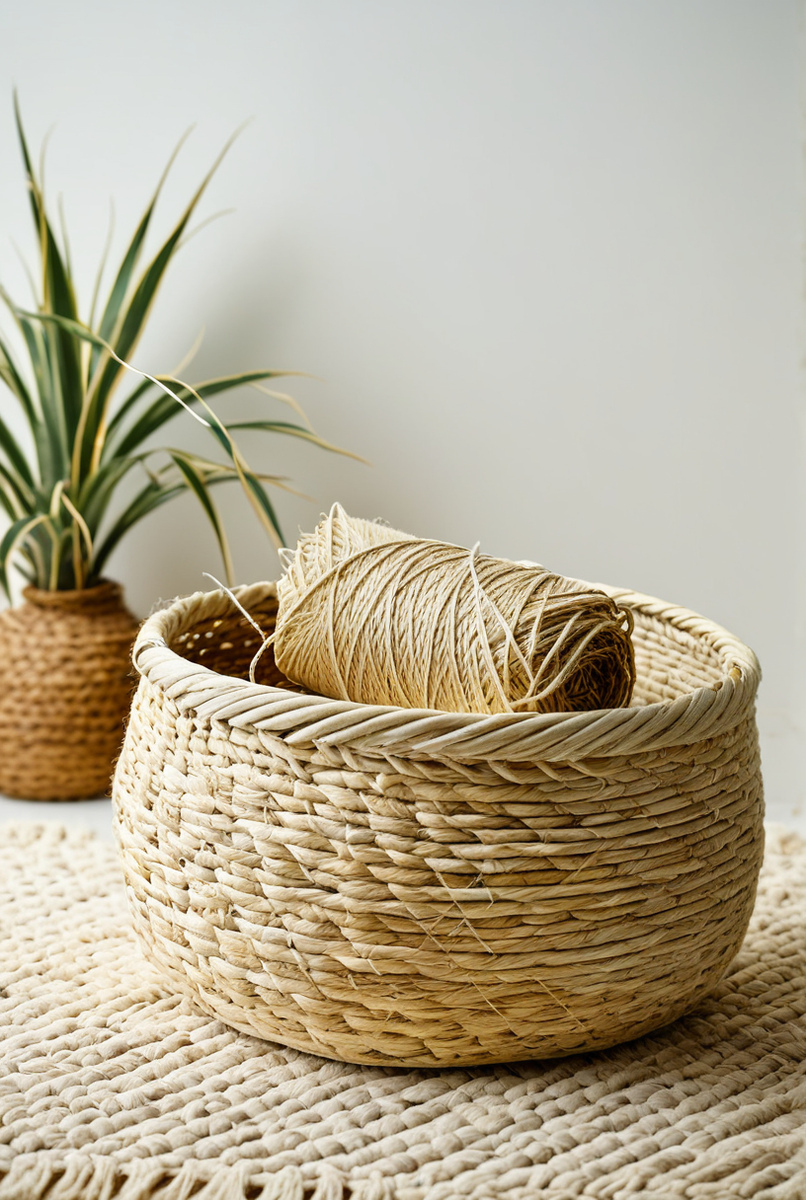 Плетение – одна из старейших и наиболее эффективных техник, где сизаль проявляет свои лучшие свойства. Из сизалевого шпагата или пряжи можно создавать прочные и красивые корзины для хранения мелочей, игрушек или белья. Такие корзины не только функциональны, но и служат прекрасным элементом декора, добавляя в интерьер нотку природного стиля. Также из сизаля можно плести уникальные коврики – от небольших прикроватных до полноценных напольных, которые будут приятны на ощупь и устойчивы к износу благодаря природной прочности волокна. Возможности плетения также включают создание декоративных подставок, салфеток и даже абажуров для ламп, что придает помещению уют и тепло.