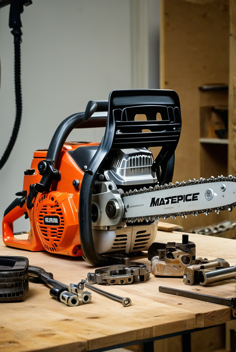 Сердце бензопилы — двухтактный двигатель. Стартер запускает его, карбюратор готовит смесь, а сцепление передает вращение на пильную гарнитуру, состоящую из шины и цепи.