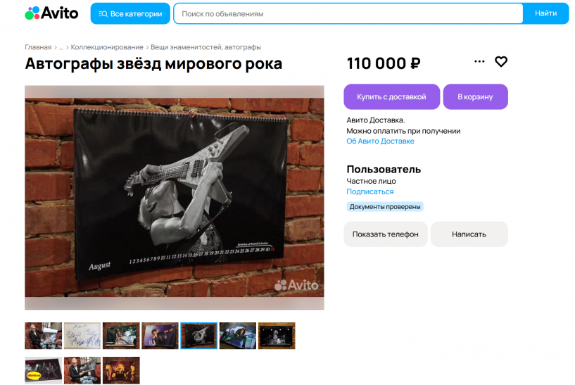 Житель Новосибирска выставил на продажу коллекционный набор, связанный с немецкой рок-группой Scorpions. Объявление размещено на одной из популярных онлайн-площадок. По словам продавца, автографы музыкантов были получены во время их гастролей по России в 2011 году. Вместе с подписями он предлагает редкий вечный календарь группы. Его отличает особый формат — на нём указаны только числа месяца и дни рождения участников коллектива, поэтому календарём можно пользоваться ежегодно. Стоимость лота составляет 110 тысяч рублей. В объявлении уточняется, что цена сформирована с учётом подлинности автографов и эксклюзивности календаря. Читайте также на портале Om1.ru 1,5 млн рублей за инструмент 50-х: почему новосибирец оценил старый рубанок в стоимость квартиры
