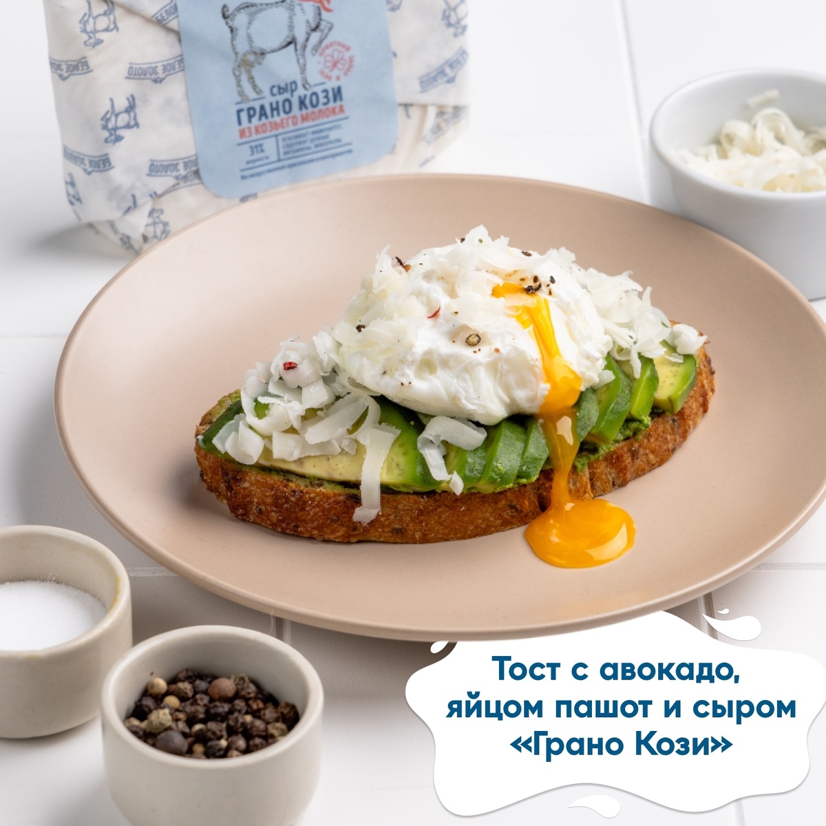 Красиво, полезно и вкусно: готовим питательный завтрак за 10 минут! Всего один ингредиент сделает обычный завтрак запоминающимся — сыр из козьего молока «Грано Кози». Именно он превращает тост с авокадо в блюдо, ради которого хочется просыпаться пораньше. Когда вы натираете сыр тонкой стружкой на горячий тост, он слегка подтаивает и в полной мере раскрывает свой потрясающий сливочный вкус и аромат. Ореховые нотки сыра прекрасно сочетаются с кремовым авокадо и нежным яйцом пашот. Ингредиенты: 1. Хлеб цельнозерновой или чиабатта — 2–3 ломтика