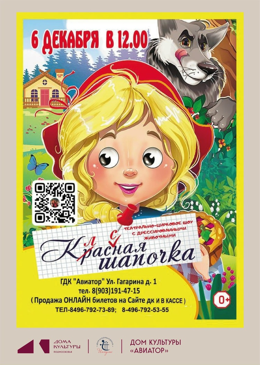 ✨ Театрально-цирковое шоу «Классная Шапочка». «Классная Шапочка» - это приключение маленькой девочки в лесу, по дороге к бабушке. Смелая, маленькая девочка встречается в волшебном лесу с известными лесными героями. По пути Классной Шапочке встретится хитрый и страшный Волк со своими друзьями, Мишка Топтыжка, мудрая всезнающая Каркуша. Для Классной Шапочки этот путь будет увлекательно ярким и опасным.. В спектакле заняты ведущие актеры театра, кино, цирка (с дрессированными животными). 🚫 Возраст: 0+ 📆 06.12.2025🕒12:00 🏢 Городской дом культуры «Авиатор» 📍 г. Домодедово, ул.Гагарина, д.1 🎫 Купить билет: https://vk.com/away.php?to=https%3A%2F%2Fiframeab-pre4796.intickets.ru%2Fseance%2F66488184%2F%23abiframe&utf=1 ✅ Мероприятия Домодедово https://dzen.ru/id/66f10385cc4c5a16f7b5fb02 http://vk.com/domodedovo_events http://dzen.ru/domodedovo_events