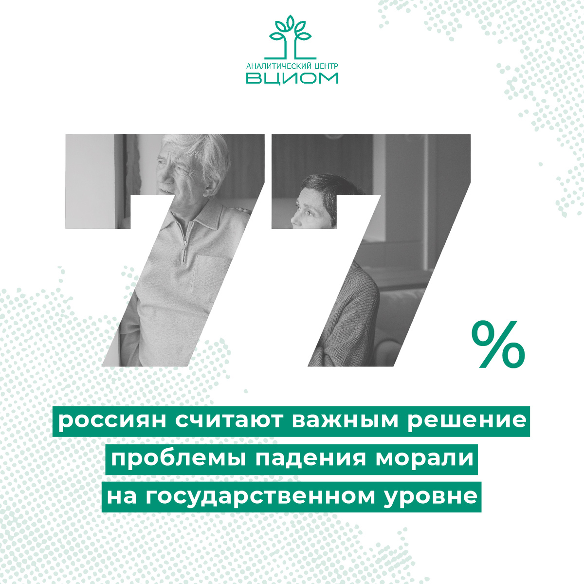 За последние два десятилетия взгляды на морально-нравственную обстановку в стране сильно изменились. Если в 2005 году в оценках динамики нравственного состояния российского общества преобладал пессимизм, то сейчас соотношение негативных, позитивных и нейтральных оценок сравнялось. Морально-нравственный климат в личном окружении россиян остается стабильным: 55% опрошенных констатируют отсутствие каких-либо изменений в этом вопросе. В вопросах формирования нравственных ориентиров многие возлагают ответственность на государство. Оно воспринимается как главный авторитет, определяющий, продвигающий и защищающий эти ценности в обществе. Источник: АЦ ВЦИОМ