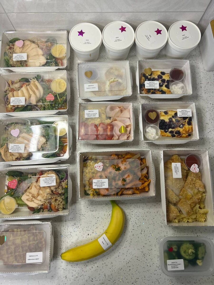 #ваши@dolceedaзаказы Рацион питания на 4 дня (в сб и вс без ужина и второго перекуса), замена молочной продукции на безлактозную Скрембл со шпинатом и ветчиной Творожная запеканка с джемом Сырники с маком с джемом Суп Харчо Салат с куриной грудкой су-вид Шашлычки из форели с бататом фри и консервированной кукурузой Стрипсы куриные с макаронами и малосольными огурцами