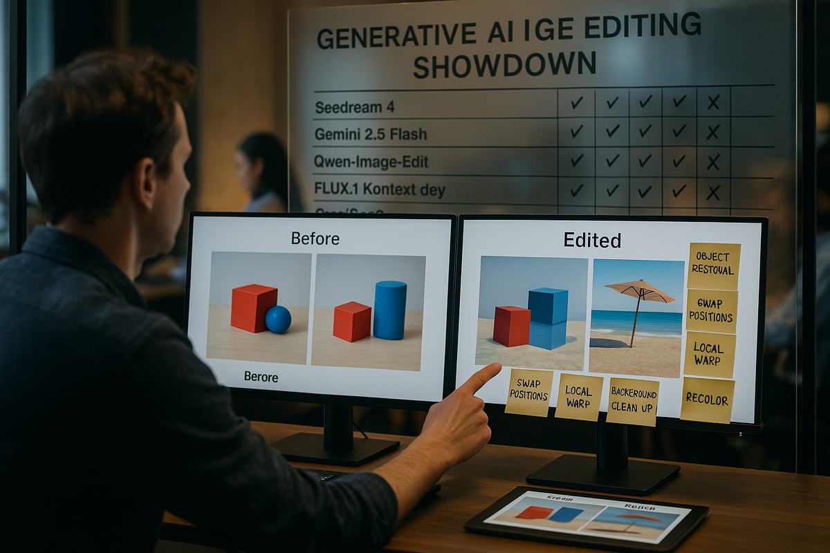 🧠 Seedream 4 — абсолютный фаворит теста, набрал 9 из 12 возможных успехов. Разработанная ByteDance модель уверенно редактирует цвет, стиль и мелкие детали, но «спотыкается» на точном позиционировании объектов. Например, вместо перестановки блоков местами она просто перекрашивала их.