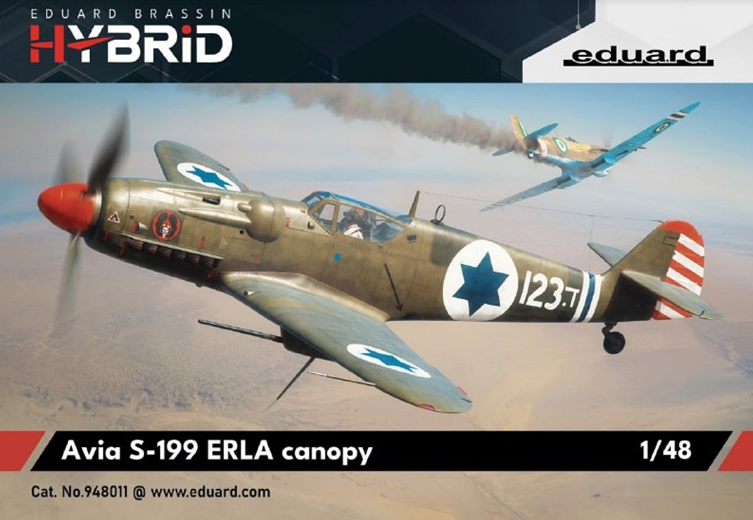 Eduard из Чехии показала варианты окраски своей модели Avia S-199 с фонарем кабины Erla в масштабе 1/48. Исполнение набора Hybrid Brassin edition (с выращенными на 3D-принтере деталями для создания этой модификации "Мессершмитта"): Avia S-199 Erla Canopy (каталожный номер 948011)