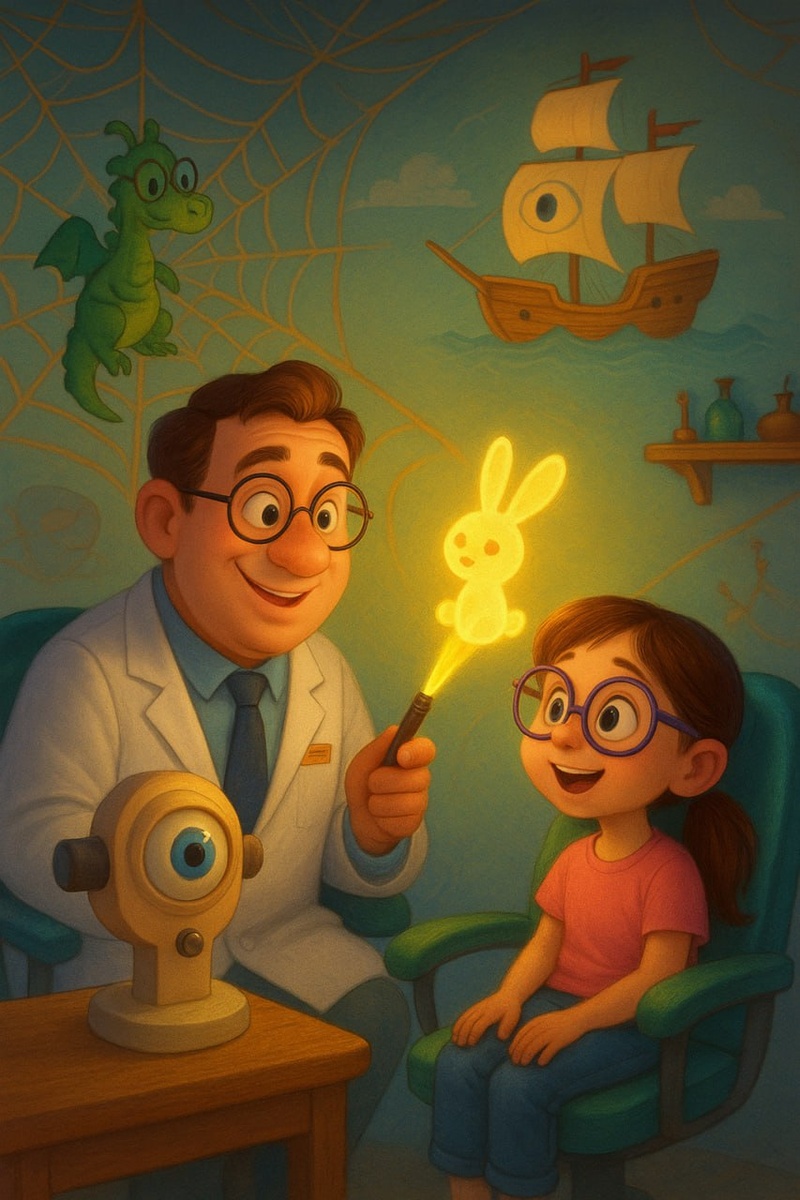Сказка «Доктор и Солнечные-Зайчики» В славном городе Уютске жил да был необычный доктор. Звали его Олег Светославович, и был он детским окулистом. Но его кабинет совсем не был похож на строгий медицинский кабинет. Он напоминал волшебную лабораторию Зрения. Стены там были раскрашены не просто так, а в виде чудесной паутинки. С одного конца в неё был вплетён смешной дракончик с огромными очками на носу, а с другого — корабль с парусами-глазами, который плыл к острову Чёткого Видения. Даже инструменты у Олега Светославовича были волшебные. Его главный аппарат для проверки зрения был похож на огромного доброго циклопа: дети заглядывали в его единственный глаз и видели там не скучные буквы, а картинки — белочку на ели, кораблик вдали и воздушного змея, улетающего в небо. Но самой главной его магией были Солнечные Зайчики. Доктор брал в руки свой особый фонарик, и на стену тут же выпрыгивал весёлый световой пёсик-зайчик по имени Блик. «Ловись, ловись, Блик!» — смеялись дети, а доктор в эт