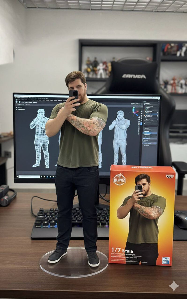 1⃣ Заходим в бот 👉 t.me/Darv_aibot 2⃣ Нажимаем: ⚡️Нейросети → 🍌 Nano-Banana → Редактировать изображение (вторая кнопка) 3⃣ Бот предложит загрузить фото → загружаем 📸 4⃣ Далее бот попросит ввести промт → ✍ пишем: Create a photorealistic 1/7 scale character figure in a commercial product photography style. Show the finished figure displayed on a transparent circular acrylic base, with the pose stabilized naturally – for example, by a clear acrylic rod attached to the base or by the figure’s foot pegged securely into the base. Behind the figure, place a BANDAI-style packaging box printed with the full-color original 2D artwork of the character. On the computer monitor, display the character’s gray clay sculpt in ZBrush, focusing only on the digital model itself as it appears during the sculpting stage. Set everything on a clean computer desk indoors, illuminated with soft, realistic lighting that highlights the textures of the figure, adds subtle reflections to the acrylic base,