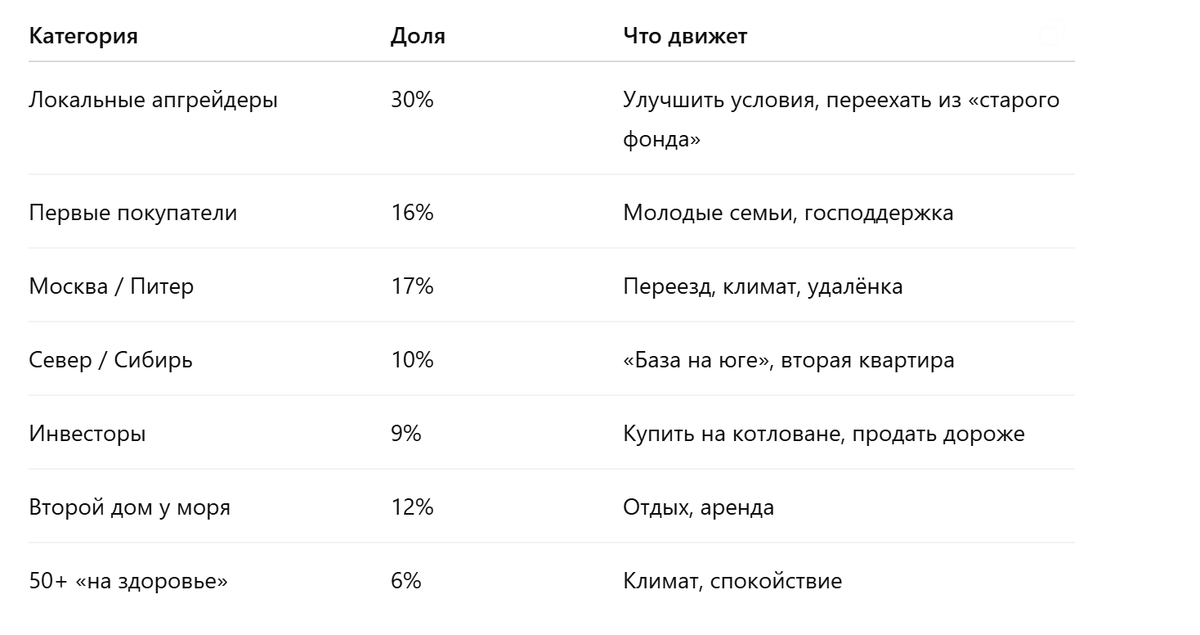 Это падение почти на 15 процентных пунктов. В игру возвращаются покупатели с наличными — в основном из других регионов. До 40–65% сделок совершают жители других регионов. Краснодарский край выходит из эйфории и входит в фазу зрелого рынка. Кр