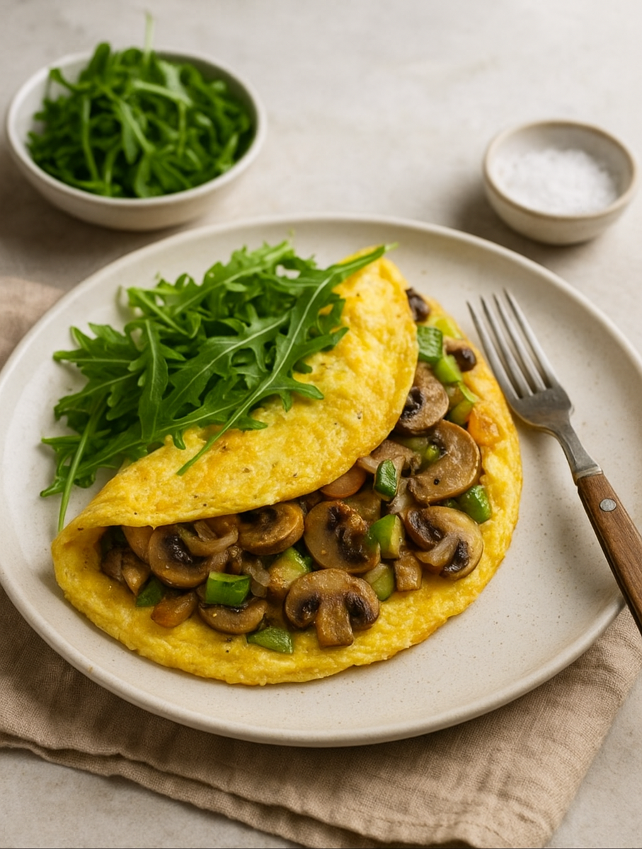 Большое количество овощей делает этот омлет не только вкусным, но и очень сытным. Нежные кабачки, ароматные шампиньоны и легкая остринка лука создают гармоничный вкус, а свежая рукола добавляет пикантность. Это идеальный вариант для лёгкого завтрака или быстрого ужина. 💡 Совет: если хотите сделать блюдо ещё более ароматным, добавьте немного свежемолотого перца или каплю лимонного сока перед подачей. Помойте овощи и ополосните руколу. Очистите лук. Лук — мелкими кубиками, грибы и кабачки — тонкими слайсами. На сковороде растопите масло, добавьте лук и жарьте до золотистости. К луку выложите грибы и кабачки. Посолите. Готовьте до мягкости овощей. В отдельной миске взбейте яйца венчиком. Влейте в сковороду, уменьшите огонь, накройте крышкой и готовьте до тех пор, пока верх не схватится. Готовый омлет переложите на тарелку, украсьте руколой. Подавайте горячим. Омлет отлично сочетается с цельнозерновым хлебом или ломтиками авокадо. Можно добавить немного сыра — он растает и сделает текст