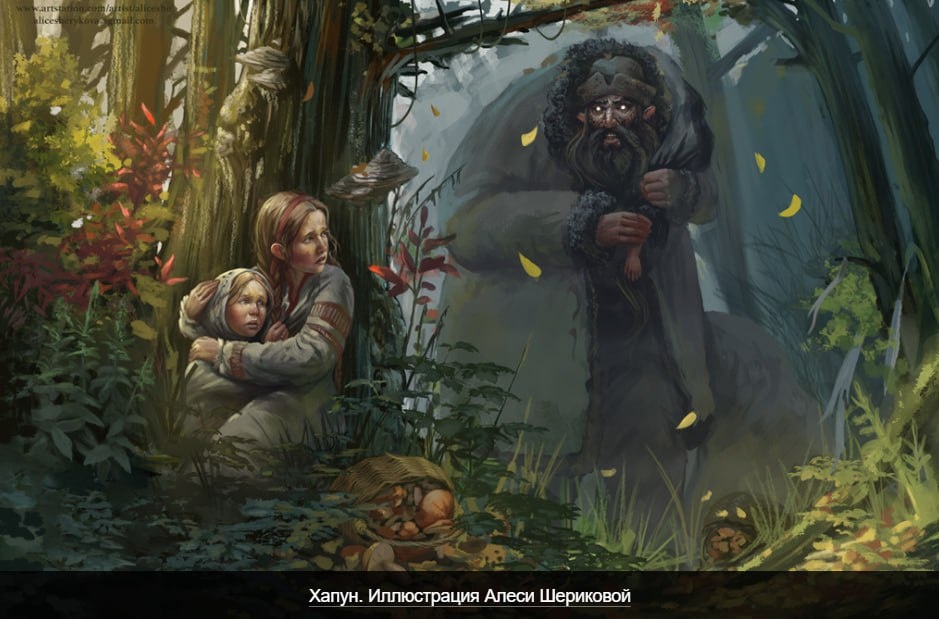 📚 Исследуем белорусскую мифологию • Хапун – скрюченный старик с длинной бородой и большим мешком. Он похищает непослушных детей. Хапун летает по воздуху и хватает детей, которые отошли далеко от дома и прячет их в свой огромный мешок. Позвать на помощь дети из мешка не могут. Сам же Хапун невидим для окружающих до тех пор, пока не затащит ребенка в своё логово в болоте за темным лесом. С тех пор никто из детей уже никогда не возвращается домой. По легенде, выросшие дети тоже становятся Хапунами. По еще одной версии, Хапун помимо непослушных детей похищал евреев независимо от возраста, и связан с иудейским праздником Йом Кипур (Судный день). Согласно поверьям, в этот день злой дух Хапун хватает одного еврея или еврейку и уносит их с собой. ☕️ Вандруй | Подписаться ● Самые интересные посты