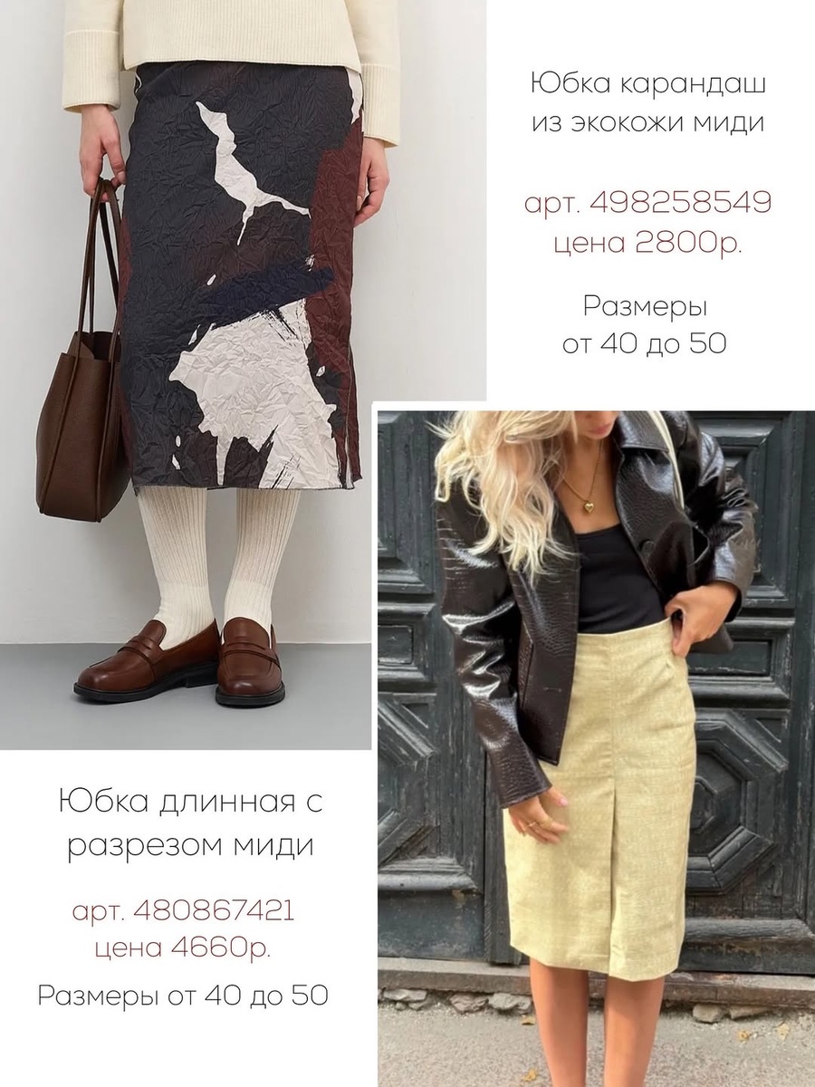 - Вторник. Юбка с разрезом (арт. 480867421) + тонкий гольф + короткая шуба с принтом (арт. 495920728).
