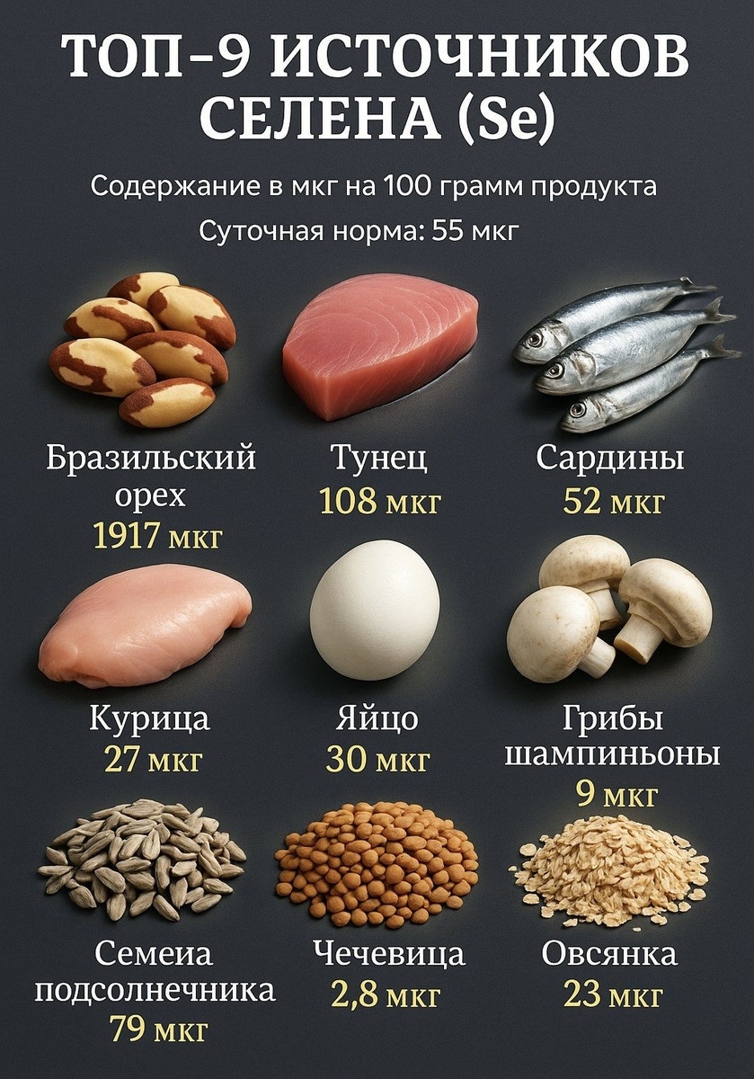 Здравствуйте, дорогие читатели! На связи ваш доктор. Сегодня поговорим о веществе, которое многие недооценивают, — о селене. Его часто называют «микроэлементом», и не зря: нам нужно его совсем немного, около 50-70 мкг в сутки. Но без этой крохи нормальная работа организма просто невозможна! Давайте разберемся, почему он так важен и как не допустить его дефицита. Щит и меч: на что влияет селен в нашем теле? Представьте себе селен как диспетчера и телохранителя для ваших клеток. Вот его главные задачи: 1. Мощный антиоксидант. Селен входит в состав важнейшего фермента глутатионпероксидазы. Этот фермент — наш внутренний защитник, который обезвреживает свободные радикалы, повреждающие клетки и ускоряющие старение. Проще говоря, селен помогает нам дольше оставаться молодыми и здоровыми. 2. Защитник щитовидной железы. Щитовидная железа — наш «дирижер» обмена веществ. Селен необходим для преобразования неактивного гормона Т4 в активный Т3. Без него щитовидка не может работать полноценно,