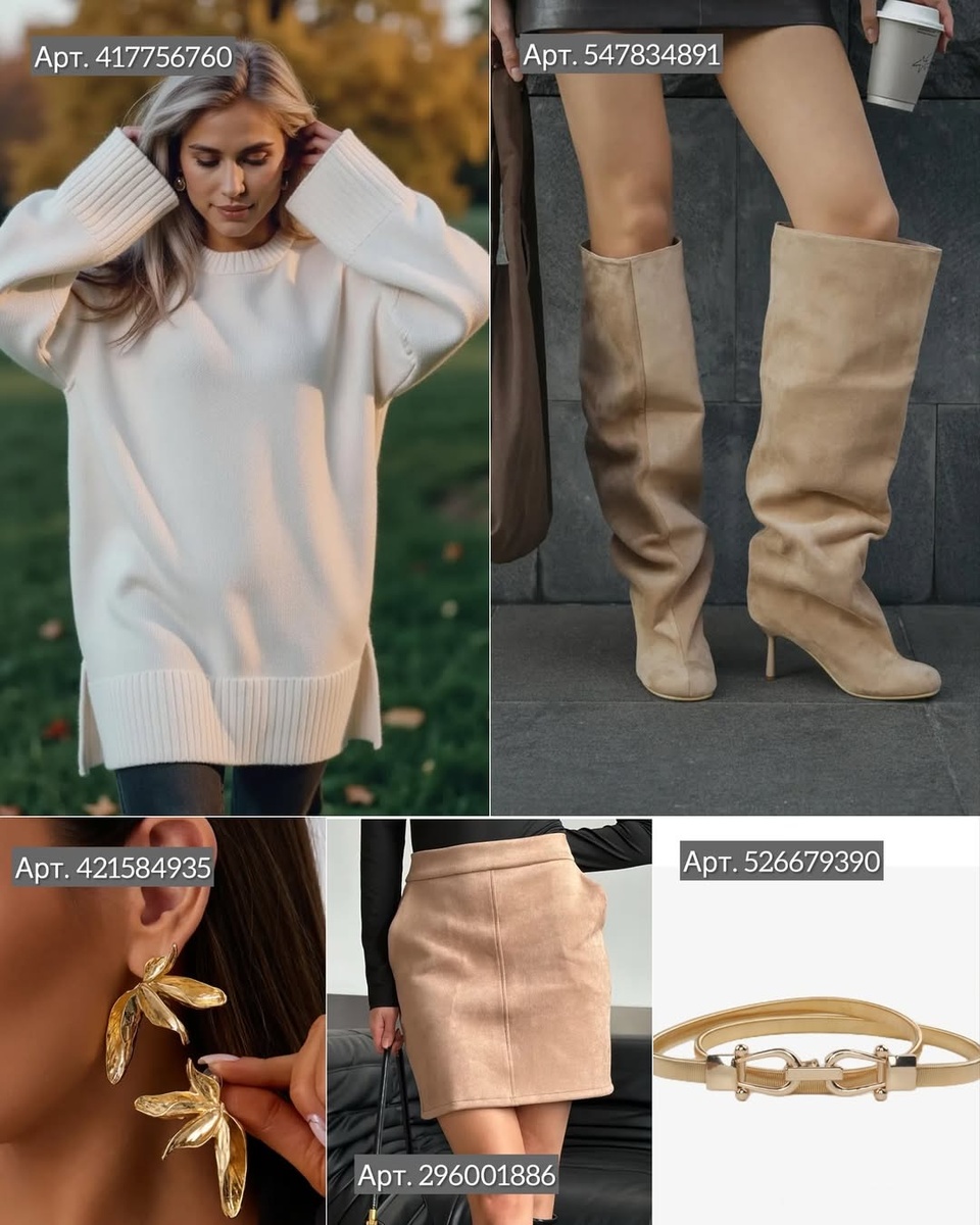 - Нежная классика: свитер молочный (арт. 417756760) + юбка-мини (арт. 296001886) + сапоги высокие (арт. 547834891) + ремень (арт. 526679390) + серьги-листки (арт. 421584935).