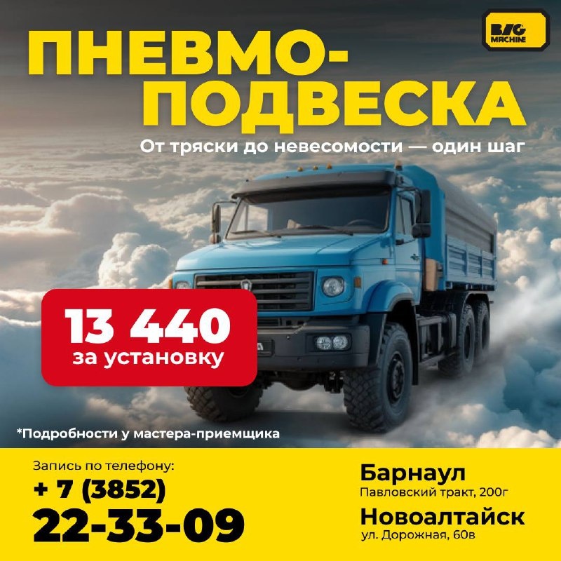 🚛 Прокачай свой грузовик по полной! Самое время задуматься о комфорте и надежности на дороге 🦾 Зачем тебе пневмоподвеска? ☑️ Забудь про крены кузова при неравномерной загрузке — машина держится ровно и уверенно. ☑️ Больше никаких пробоев и жёстких ударов — только плавный, комфортный ход. ☑️ Регулируй клиренс под себя — груз, трасса или бездорожье, твой грузовик справится с любыми условиями. 🔥 Успей записаться, пока действует спеццена — 13 440₽ на установку пневмоподвески. 📲 +7 (3852) 22-33-09 Мы находимся по адресам: 🟡 Барнаул, Павловский тракт, 200г 🟡 Новоалтайск, ул. Дорожная, 60в 💬 А ты ощущал разницу с пневмоподвеской? Расскажи в комментариях!