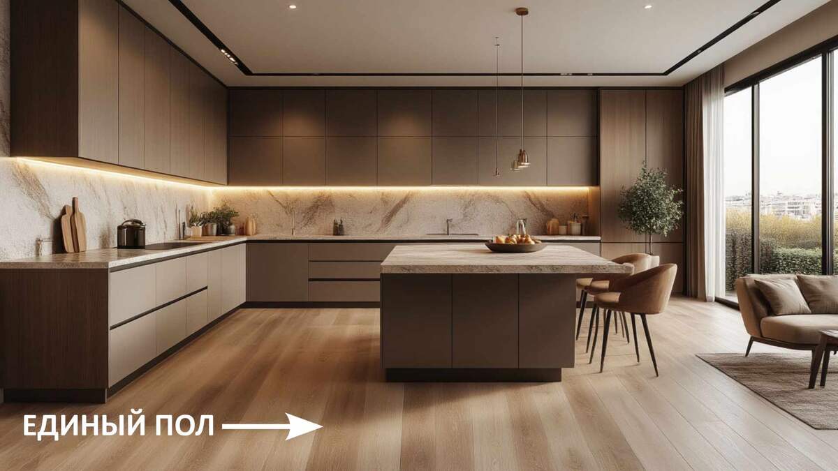 Почему стабильность важнее «картинки». На больших площадях пол «играет»: расширяется, сжимается, получает точечные нагрузки у мебели. Красивый декор проигрывает устойчивости геометрии. Если замок и сердечник держат форму — швы остаются плотными, рисунок не «плывёт», тёплый пол не провоцирует щели. SPC — лидер для студий и длинных коридоров. Каменно-полимерный композит жёсткий и влагостойкий, несёт большие пролёты и выдерживает режимы ТП при тонкой TP-подложке. Замки работают уверенно, пол не «дышит» волнами, поэтому кухня-гостиная на 25–40 м² одним полотном — его стихия. Минус: тактильно чуть прохладнее — решается умеренным подогревом. LVT (клеевой/Click): где монолит, а где «плавающий». Если нужна тишина и мягкость — замковый LVT хорош в жилой зоне. А у гарнитура, в «мокрых» и проходных участках (мойка, вход на балкон) лучше клеевой LVT: он создаёт монолит, где воде и песку просто не к чему прицепиться. Комбо «Click в общем поле + клей у кухни» отлично работает и визуально, и по рес