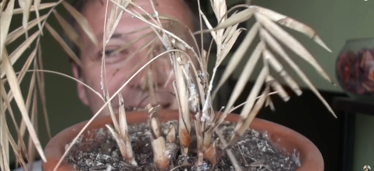 Друзья, всем привет! Посмотрите на это растение — настоящий памятник тому, как вредители могут уничтожить цветок. Это не орхидея, а обычное комнатное растение, связанное с пальмовыми. Оно простояло у меня полтора года в дальнем углу подсобки, и я все собирался его выкинуть, но руки не доходили. А сегодня увидел и решил поделиться этой историей с вами. Это яркий пример работы мучнистого червеца, который высосал все соки из бедняги.