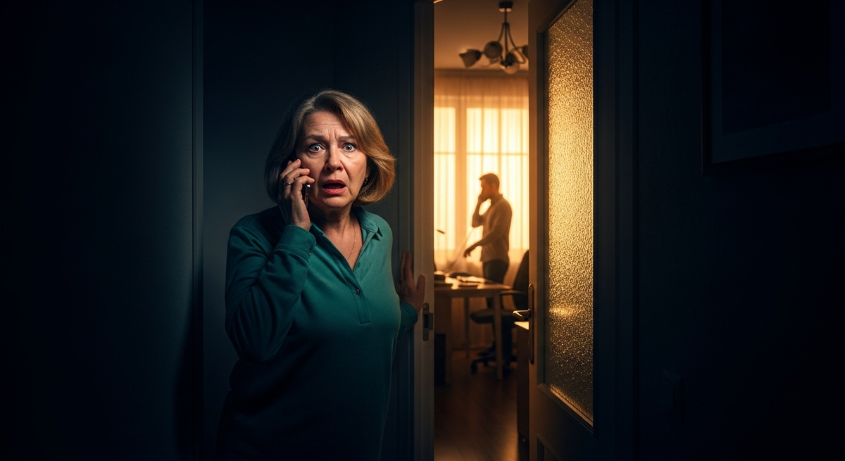 Виктор стоял у окна, держа телефон у уха. Услышав шаги, он резко обернулся. Лицо его исказилось от испуга.