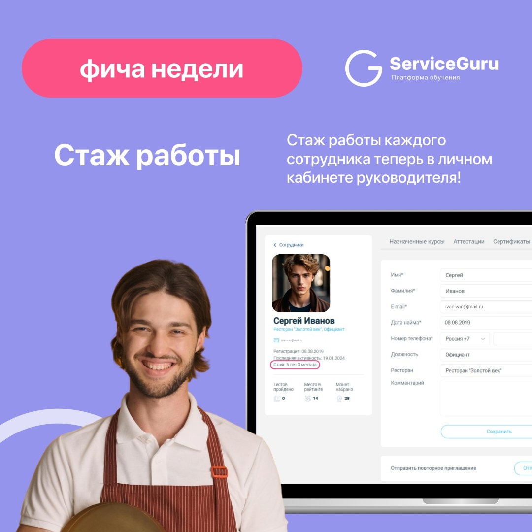 Фича недели: Стаж работы 👔 🤩 В ServiceGuru в кабинете руководителя отображается стаж работы каждого сотрудника. Для чего? 💡 ✅Признание Используйте информацию о стаже для планирования карьерного трека сотрудников и создания бонусных программ. ✅Обучение Новичкам можно предложить базовые курсы, а опытным сотрудникам — продвинутые программы. ✅Важная дата Поздравляйте сотрудников с годовщиной в компании и выражайте благодарность с помощью Ленты новостей 🗝 Получить бесплатный демо-доступ к платформе #фича_недели
