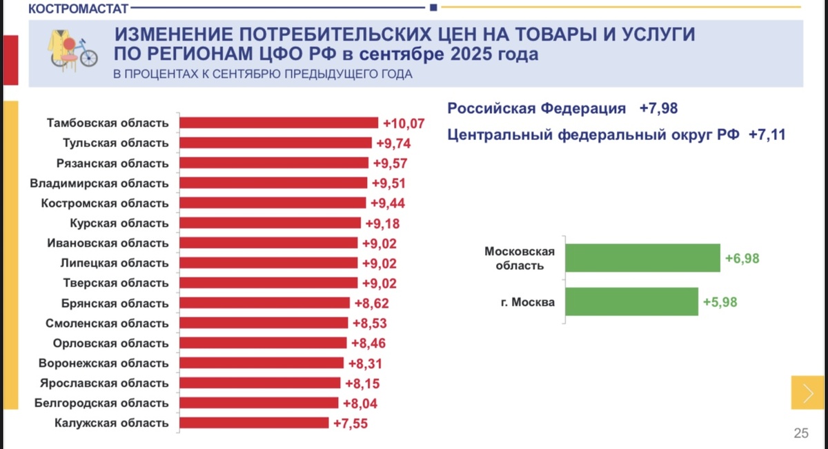С начала года повышение общего уровня цен в регионе превысило 6% По данным Костромастата, за январь-сентябрь 2025 года инфляция составила 6,01%, а в годовом выражении — 9,44%, что выше среднероссийского показателя. Наш регион вошел в пятерку самых «дорогих» субъектов Центрального федерального округа. Пьедестал разделили также Тамбовская (+10,07%), Тульская (+9,74%), Рязанская (+9,57%) и Владимирская (+9,51%) области. Примечательно, что в Костромской области больше всего подорожали продукты и услуги. Рост цен на продукты в Костромской области оказалось земетно выше среднеокружного уровня. Продовольственные товары подорожали на 6% с начала года. Особенно резко выросли ценники на рыбу и морепродукты — на 18,1%, на кондитерские изделия — на 11,2%, на молочные продукты — на 6,4%. Колбаса и мясо добавили 5-5,5%, а мука и крупы — около 1%. Среди конкретных позиций лидером по стоимости стала свинина, которую в торговых точках продают в среднем по 398 рублей за килограмм. Это выше, чем в соседн