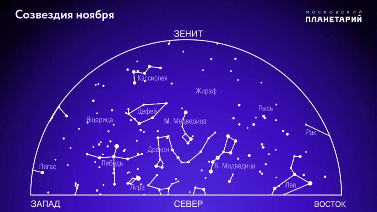 Красиво ночное звёздное небо ноября. В ясную морозную ночь над горизонтом можно увидеть все яркие звёзды зимних созвездий. В ноябре после полуночи на востоке из-за горизонта поднимается созвездие Лев с яркой звездой Регул, а на северо–востоке, высоко над горизонтом располагается Большая Медведица. На севере легко найти Полярную звезду в Малой Медведице и Дракона. Высоко в зените узнаваемый «Домик» созвездия Цефей и «Перевернутая М» Кассиопеи. На северо-западе, также вблизи горизонта, видны созвездия Лира и Лебедь – ярко сияют Вега и Денеб. В южной части неба, недалеко от зенита, можно полюбоваться созвездием Персей, слева от него – Возничий, под ним – Телец, а еще ниже и левее (восточнее) – созвездие Орион с яркими звездами – красной Бетельгейзе и голубоватыми Ригелем и Беллатриксом. На юго-западе высоко расположены Пегас и Андромеда, под ними у горизонта – Кит. На юго-востокевысоко видны Близнецы, под ними – Малый Пес с яркой звездой Процион, а вблизи горизонта сияет ярчайшая звезда