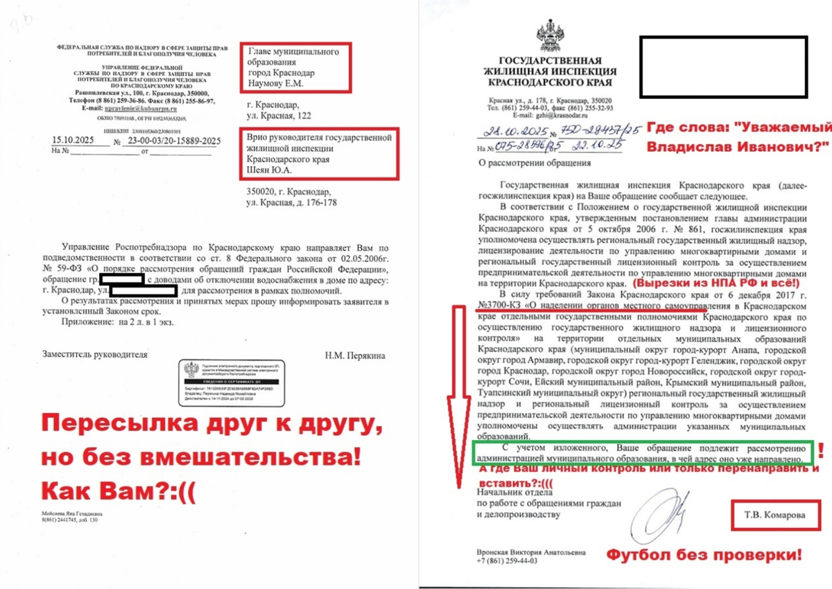 15.10.2025 я получил через ГЖИ ответ из Роспотребнадзора за № 23-0003/20-15889-2025, из которого следовало, что моя жалоба без какой-либо проверки и вмешательства была направлена в ГЖИ Краснодарского края(!?) и…главе администрации(!?).