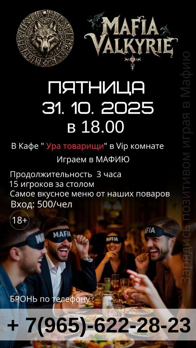 Кафе "Ура товарищи", приглашает Вас провести приятный и вкусный вечер за игрой в Мафию. Который нам любезно проведет ведущий Маф клуба "Валькирия" ✅Вход 500/чел. ✅Взрослые Будем рады Вам и вашим друзьям и близким😉 ✅Оплата и бронь по номеру, что указан в Афише, после оплаты , пожалуйста скидываем чек для фиксации участников +79656222823 Внимание, места ограничены!