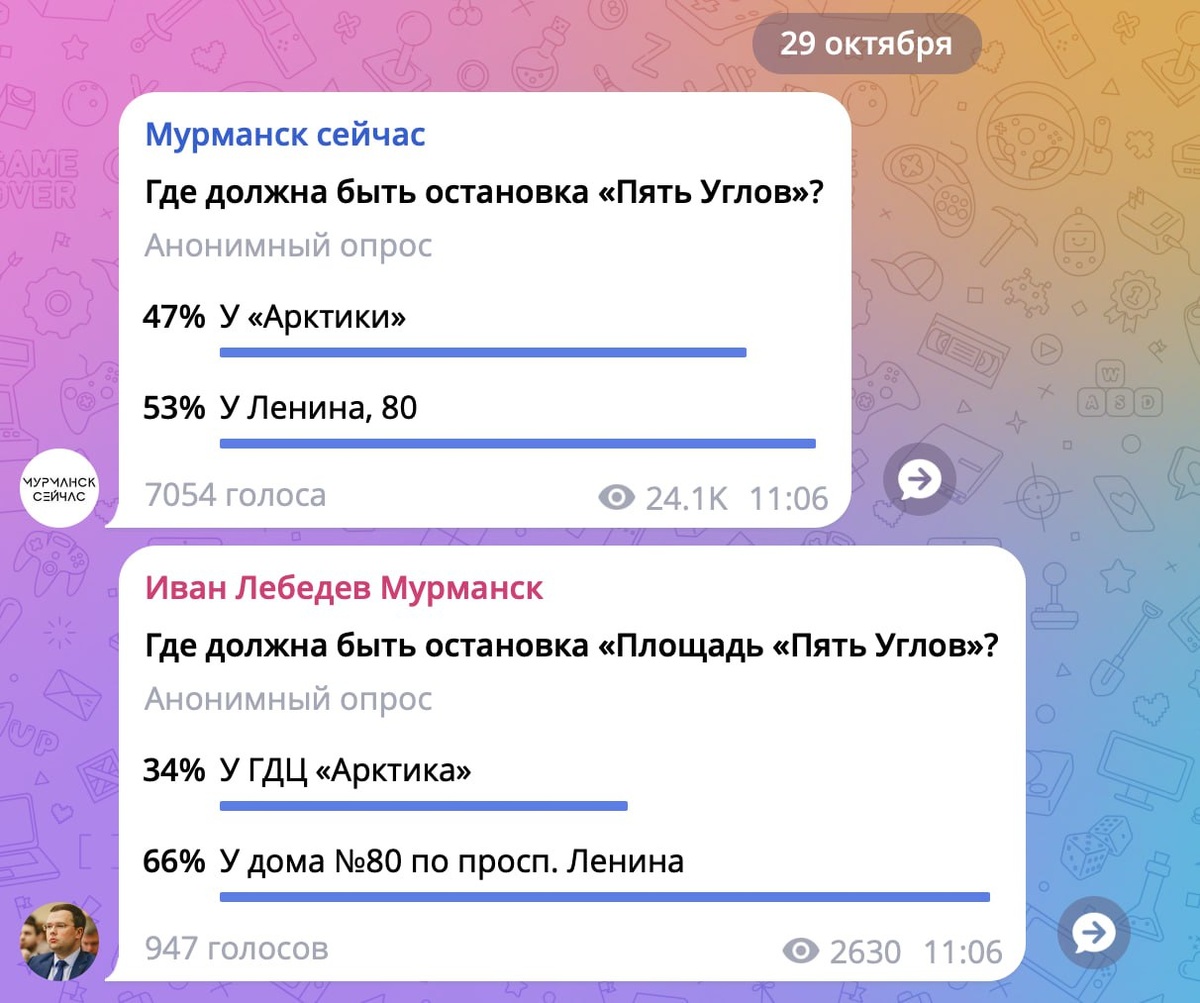 В ответ на пост Голосуй не голосуй, всё равно получишь... Сразу два голосования проходят в «ягельной тележке» относительно будущего остановки общественного транспорта «пл. Пять Углов» в сторону юга. Первое – в ТГ-канале Ивана Лебедева. На момент публикации материала в лидеры вырвался вариант с нынешнем местом (то есть, у дома № 80 по проспекту Ленина), хотя ещё накануне горожане отдавали предпочтение месту у «Арктики». Второе – в ТГ-канале Романа Глека «Мурманск Сейчас». Там в лидерах тоже Ленина, 80, но перевес не такой значительный, как у Ивана Лебедева: 47% и 53% против 34% и 66%. В совокупности два опроса набрали 8000 голосов. Где и как голосовать – решать вам. Кстати, интересны аргументы голосующих: У Арктики она выглядит более логичной: центр города, рядом почта , гостиница, прогулочная зона, у Ленина 80, по мне, она ни к селу, ни к городу. Остановка должна быть у Ленина, д. 80. Верните остановку у кафе "Юность"!!! А что не так с остановкой? От перемены мест слагаемых, сумма н