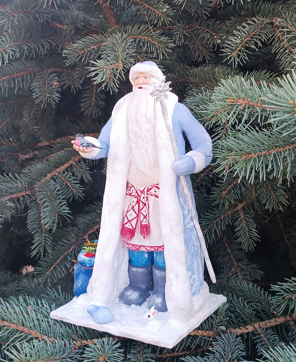 Каждая игрушка - ватная, текстильная, любая - начинает играть живыми красками, обретает настроение и характер, когда ее окружают миниатюры. Мелкие предметы в руках, дополнительные аксессуары одежды - подобные мелочи очень украшают образ. А Деду Морозу, зимнему волшебнику, особенно пристало иметь побольше сказочных атрибутов! Поэтому сделаем для него чудесный мешок с подарками, серебряный посох, проработаем рукавички и добавим животных в композицию. Начнем с мешка. Для него я специально оставила место внизу платформы. А саму платформу предварительно оклеила тонким слоем белой ваты, создав подобие снега. При этом вату не пропитывала обильно, чтобы поверхность оставалась неровной, шероховатой, имитирующей снежный покров. Далее мне потребовался толстый кусок хлопковой ваты, пропитанный клейстером. Из него я свернула мешочек так же, как я работала бы с тканью. Прорисовала складочки и отворот. Зафиксировала его сбоку шубы и заполнила игрушками. Игрушки - фигурки из гипса, отлитые в формочках