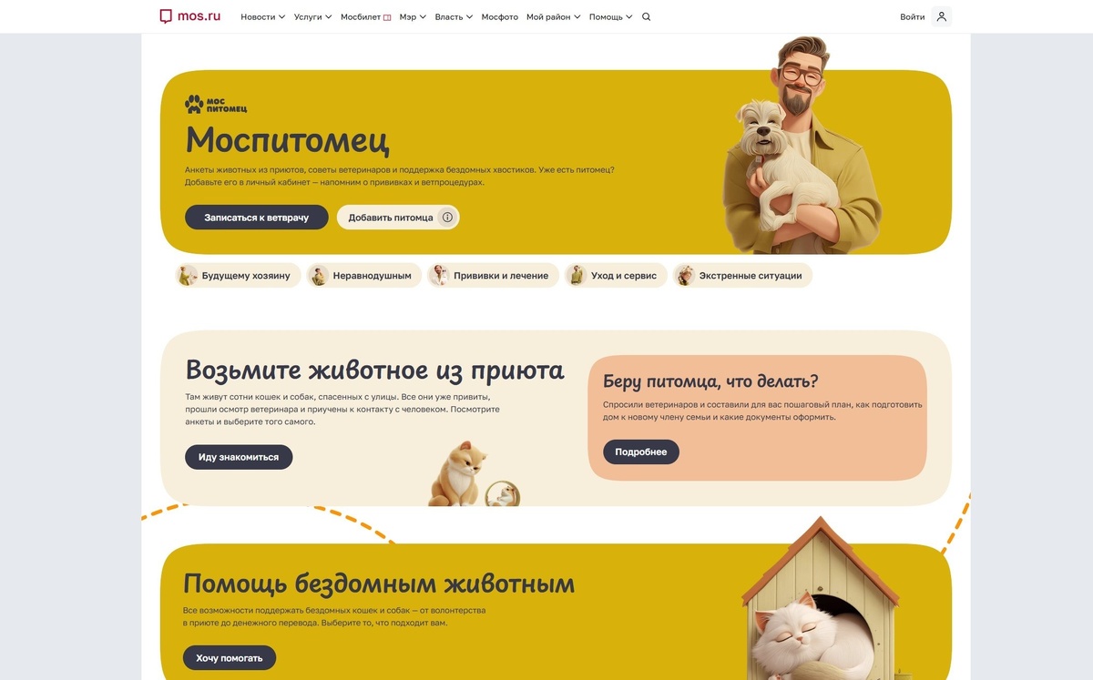 На мос.ру запустили замечательный проект https://pets.mos.ru/priyuty/ Сервис предоставляет единую базу анкет питомцев с фотографиями и описанием животных из 13 городских приютов, фильтрами поиска, тестом для подбора животного, вплоть до организации встречи с выбранным питомцем. Сегодня цифровизация – это фундамент развития Москвы, и то, как поменялся портал Мос.ру за последние 10 лет – яркое тому подтверждение. Портал помогает жителям столицы в большинстве жизненных сценариев, экономит их силы и время, переводя все больше услуг и сервисов в цифровой формат. Очень рад, что теперь к этим сценариям добавился и поиск питомца из приюта. Основная цель сервиса – помочь найти дом как можно большему числу животных из приюта.