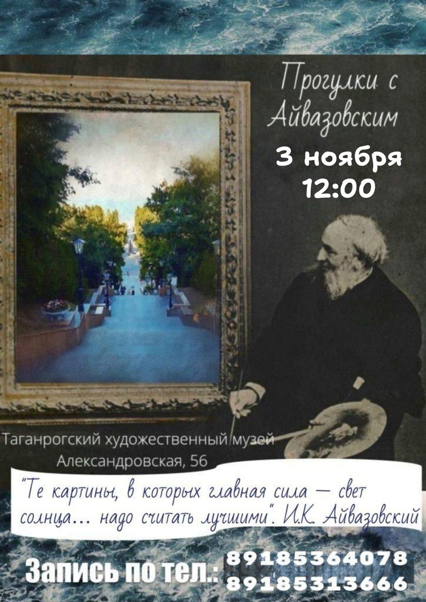 🐚🌊3 ноября в 12:00 состоится пешеходная экскурсия "Прогулки с Айвазовским". 🌅В маршрут экскурсии по улицам и переулкам города включены исторически интересные объекты и места, которые посетил Иван Константинович Айвазовский в 1895 году: Каменная лестница, дом Чайковских, дом Серебрякова, дворец Александра Первого. Великий маринист приехал в Таганрог всего на один день, но очень повлиял на культурную жизнь таганрожцев. 🌞Экскурсия напоминает увлекательный приключенческий роман, который рассказывает о незабываемой прогулке Айвазовского по южному городу. 🏛️Начало маршрута ул. Александровская, 56. ☎️Запись по тел.: 89185364078, 89185313666.