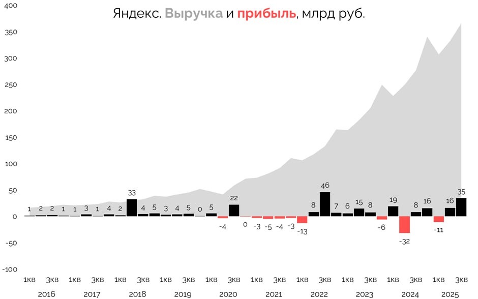 📱Яндекс — компания, которая держит слово Выручка за девять месяцев 2025 года выросла на 33,2% — до 1 трлн рублей — это все еще компания роста. При этом рост выручки не сопровождается падением рентабельности, как мы могли наблюдать у некоторых эмитентов. За девять месяцев 2025 года скорр. EBITDA составил 193,0 млрд рублей (+38% г/г). ☝️Еще одна хорошая новость — Яндекс улучшил гайденс на предстоящий год — тоже большая редкость в текущих условиях. Теперь ожидается рост выручки более чем на 30% г/г и скорр. EBITDA на 43% — до 270 млрд руб. Чистая прибыль за девять месяцев составила 40,1 млрд рублей против убытка 4,1 млрд рублей годом ранее. ⭐️Мнение GIF Картину несколько портят затраты на вознаграждение менеджменту акциями. За девять месяцев вознаграждение уже составило 3,8% от выручки. В соответствии с заявлением руководства, компания планирует эмитировать акции для программы мотивации руководства ежегодно около 2% от уставного капитала. Тем не менее, ожидаемый EV/EBITDA по итогам