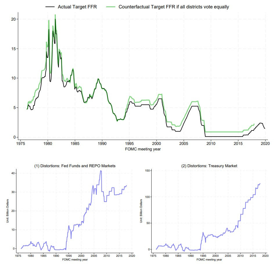 Настал очередной рабочий день ФРС, когда 7 управляющих ФРС и 5 голосующих председателей региональных ФРБ должны принять решение о снижении процентных ставок. Кроме того, есть ещё 7 председателей региональных ФРБ, которые присутствуют на заседаниях, но не имеют права голоса. Фед состоит из 12 региональных федеральных резервных банков. Вместе с управляющими ФРС они образуют Комитет по операциям на открытом рынке ФРС (FOMC). Для поддержания управляемости право голоса за снижение (или повышение) процентной ставки ограничено семью управляющими ФРС, президентом ФРБ Нью-Йорка и ежегодно сменяющимися председателями других региональных ФРБ. Это очень разумно, поскольку обеспечивает право голоса каждого региона страны и позволяет контролировать масштаб заседания и ход обсуждений, предотвращая превращение заседания в дискуссионный клуб. Однако Вячеслав Фос и Нэнси Сюй из Бостонского колледжа заметили нечто важное. Инфляция и безработица не постоянны в разных частях США, и главы региональных ФРБ,