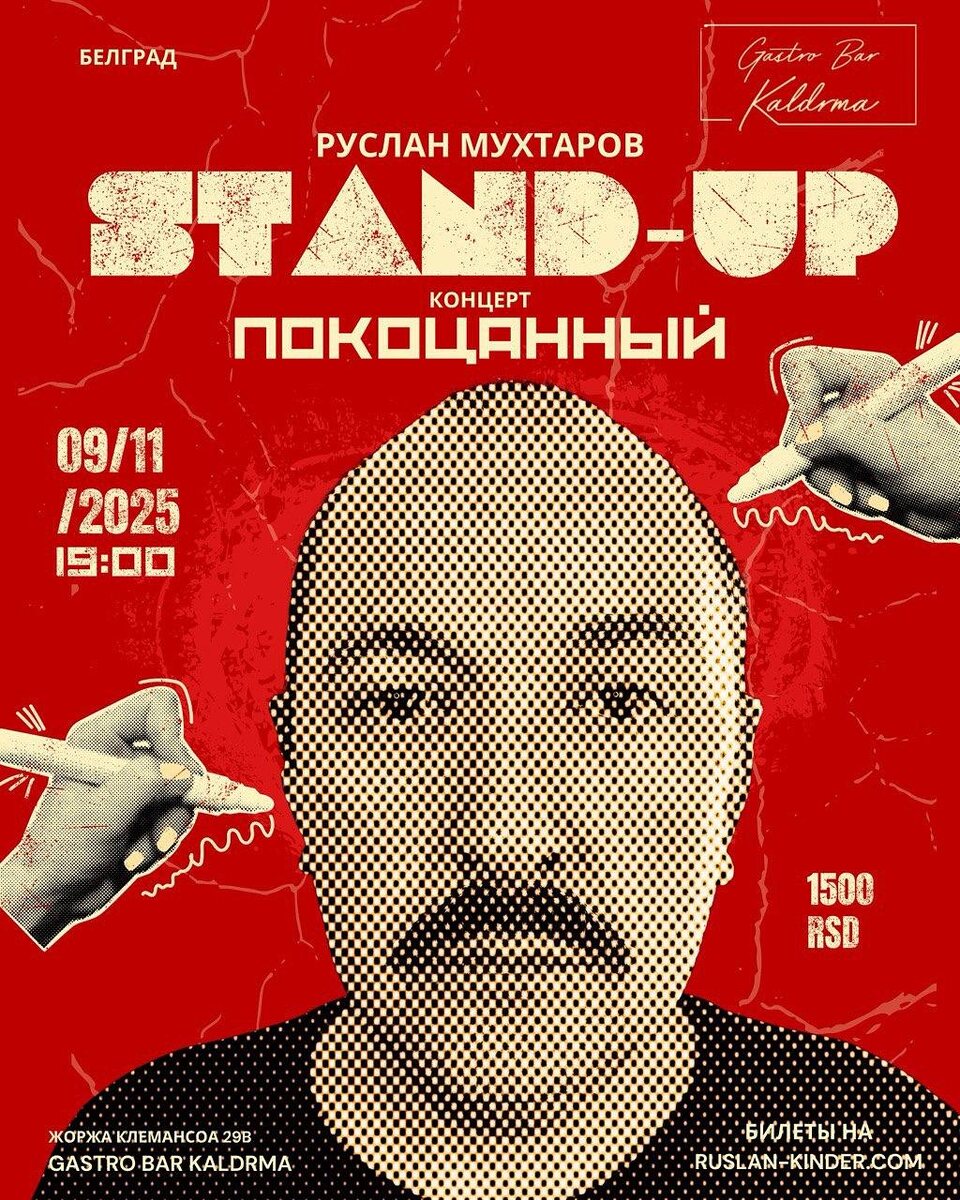 Руслан Мухтаров возвращается в Сербию с новым стендап-концертом «Покоцанный». Это концерт про жизнь, которая оставляет следы, про внутренние шрамы, про то, как не сойти с ума, когда всё вокруг шатается, и при этом остаться человеком, у которого есть чувство юмора. Руслан Мухтаров: • Участник “Открытого микрофона” на ТНТ • Победитель “Русские не смеются” на СТС • Победитель Стрим stand-up • Победитель “Рассмеши комика” на 1+1 • Член команды КВН «Будем дружить семьями» (1 канал) 📍 Gastro Bar Kaldrma, Жоржа Клемансоа 29B 🕢 Сбор гостей 18:30 🕗 Начало 19:00 🎟 Билеты 1500 RSD Билеты: ruslan-kinder.com 📲 Инфо и бронь: +381 62 1108 699