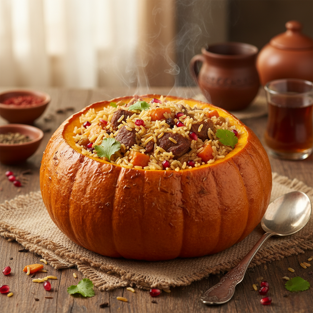 Плов – это блюдо, которое ассоциируется с теплом домашнего очага, восточной экзотикой и, конечно же, неповторимым ароматом. Но что, если мы внесем в этот традиционный рецепт немного оригинальности и приготовим плов не в казане, а в тыкве, запеченной в духовке? Это не только красиво и необычно, но и добавляет блюду новые оттенки вкуса и аромата. Тыква становится одновременно и идеальной посудой, и щедрым дарителем своей сладости и нежной текстуры. Этот рецепт – настоящий гастрономический эксперимент, который обязательно порадует вас и ваших гостей. Он требует немного больше времени и внимания, чем обычный плов, но результат превзойдет все ваши ожидания.