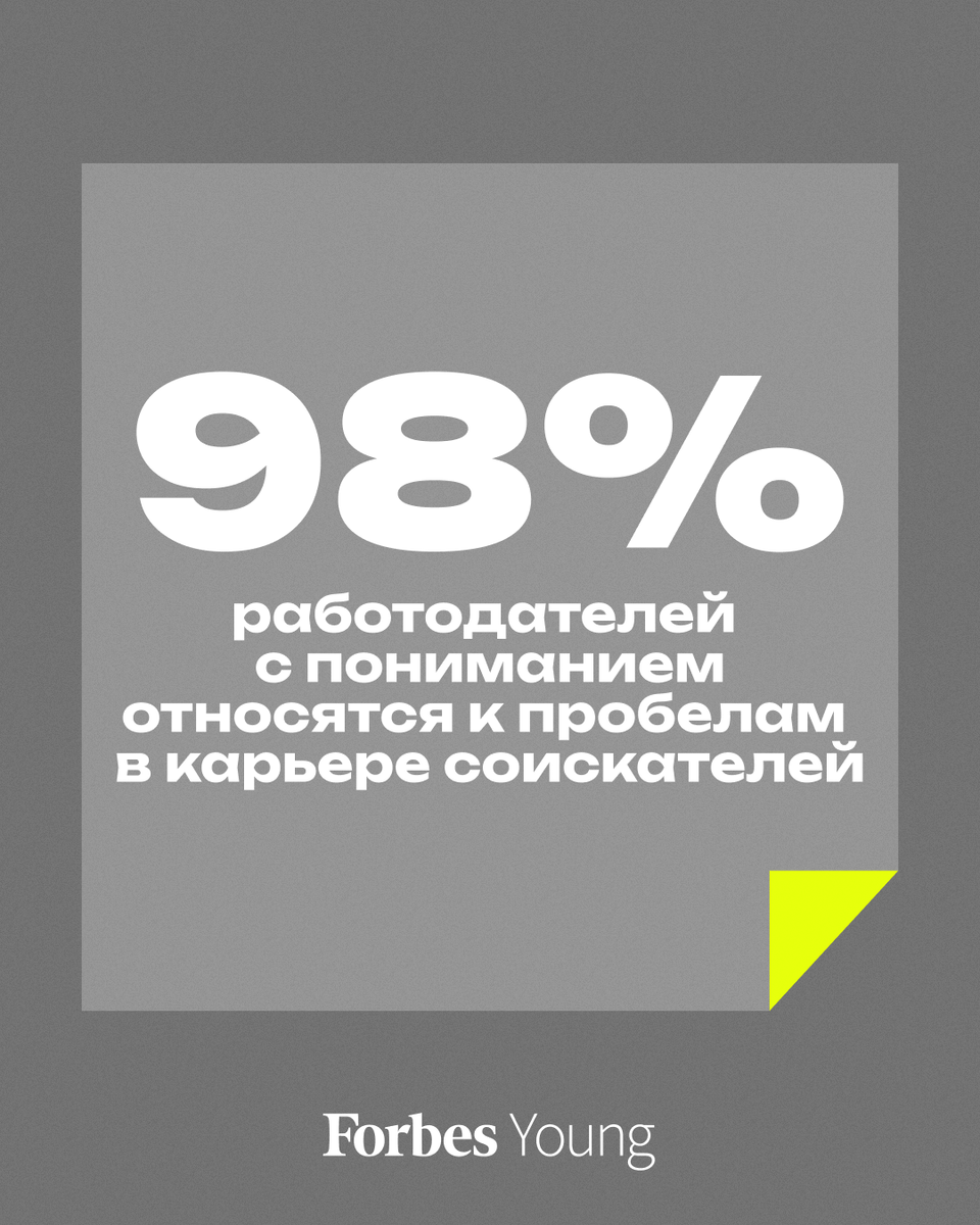Почти половина (47%) работодателей «очень часто» сталкиваются с соискателями, у которых были длительные паузы (более шести месяцев) в карьере, а каждый второй работодатель «пару раз» встречал кандидата с «белыми пятнами» в резюме, показал опрос 159 представителей российских компаний, проведенный платформой онлайн-рекрутинга hh.ru, с результатами которого ознакомился Forbes Young. Лишь 3% респондентов сообщили, что подобных случаев в их практике не было. При этом, согласно данным исследования, почти все опрошенные (98%) с пониманием относятся к перерывам в карьере. 52% считают, что все зависит от того, с чем связана пауза, а 46% ответили, что для них важнее актуальные навыки и мотивация соискателя. Лишь 2% признались, что настроены по отношению к кандидатам с «белыми пятнами» в резюме негативно и не рассматривают их. Подробнее — на сайте Forbes #работа @forbes_young