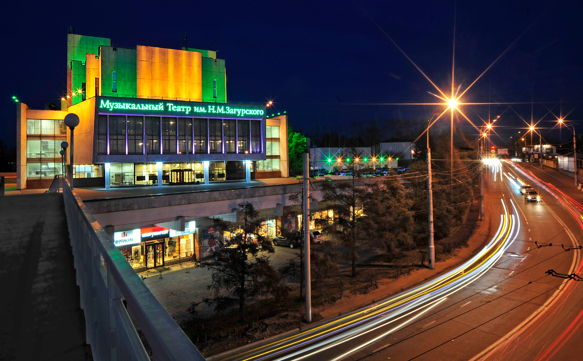 Иркутский областной музыкальный театр им.Н. М. Загурского таинственно и величественно выглядит в темное время суток. Красивая подсветка делает его похожим на гроздь изумрудных и аметистовых кристаллов. Таких, наверное, не бывает в природе, но это лишь подчеркивает исключительность нашего театра. Если же в этот вечер дают спектакль, к изумрудно-фиолетовому свету добавится янтарно-медовый, исходящий от ламп верхнего фойе, которые сами по себе являются произведением искусства (о них расскажем в других статьях). Все вместе это настраивает на встречу с прекрасным.
