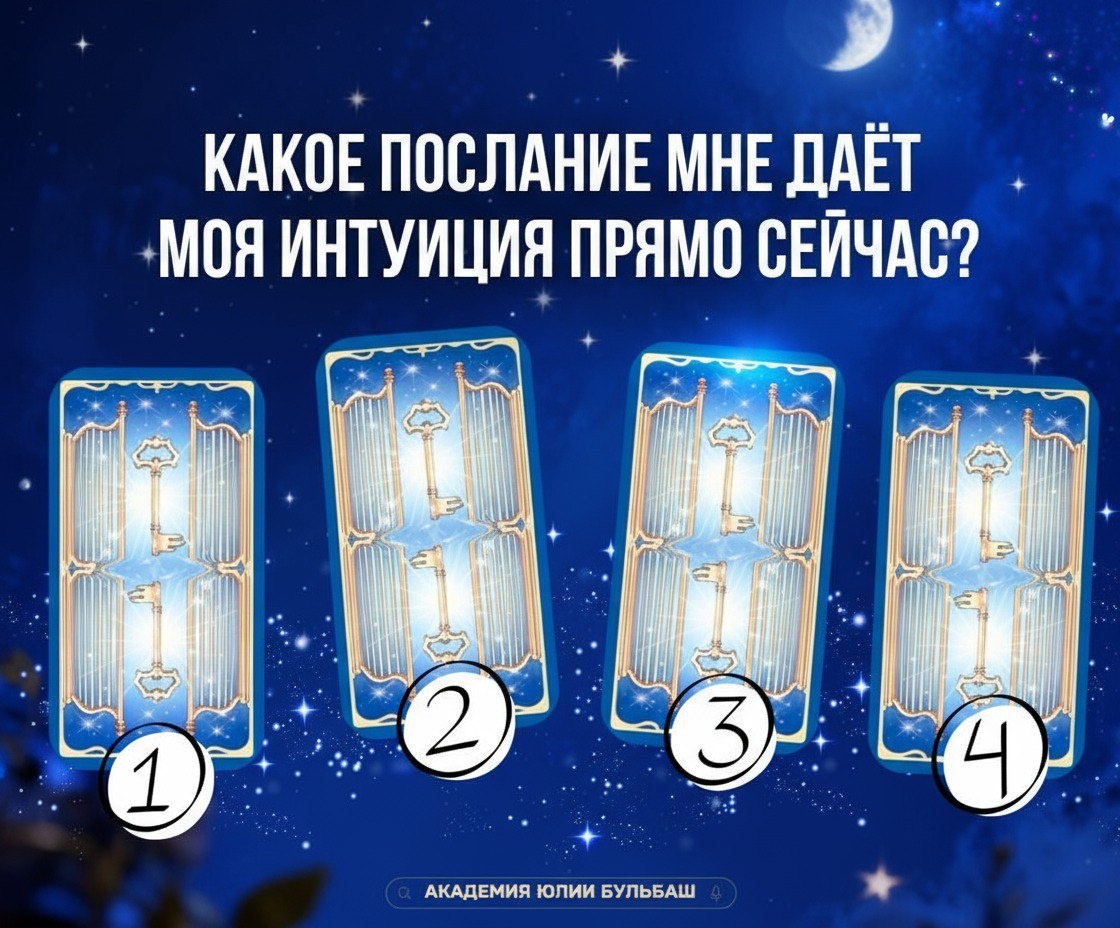 Расклад поможет услышать именно то, что вам необходимо в этот момент. • Выберите карту 1, 2, 3, или 4. Не думайте, довертись интуиции. Приглашаю в мой детеграм канал https://t.me/+YHlJMolgq6FkNTZi . Там вы найдете практики работы с таро, а так же с расстановками. Ритуалы на деньги и удачу, а еще много чего интересного и полезного. (а еще много подарков) ВСТУПИТЬ https://t.me/+YHlJMolgq6FkNTZi