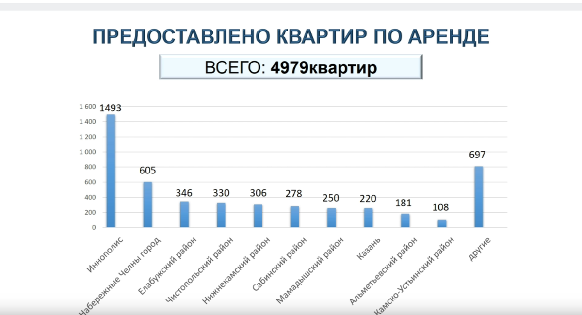 «Среди субъектов России наша республика единственная, которая это направление развивает. По программе арендного жилья в Татарстане было построено 4 979 тысяч квартир. Львиная доля приходится на города Иннополис – 1 493 квартиры, Набережные Челны – 605. И в каждом муниципалитете есть некий объем арендного фонда для приглашенных специалистов – учителей, врачей, тренеров», – дополнил Булат Гилманов.