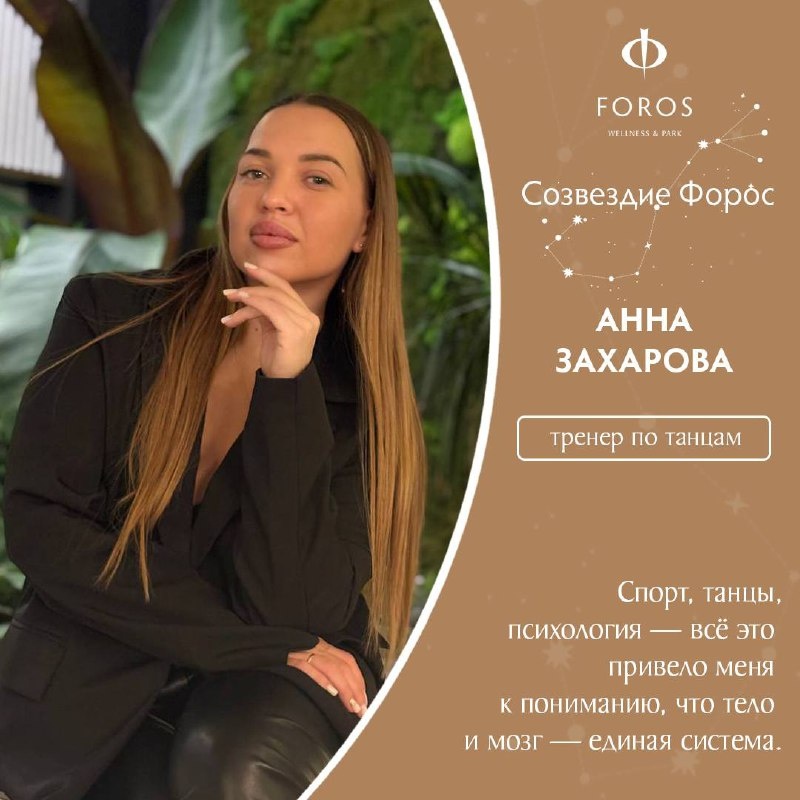 Знакомьтесь! ✨ Анна Васильевна Захарова — тренер по танцам санатория «Форос». 💫 Профессиональный багаж • В фитнес-индустрии — с 2013 года! • Квалифицированный тренер и методист в направлениях: - хореография - нейрофизкультура - пилатес - функциональный тренинг • Автор и преподаватель программы профессиональной переподготовки «Тренер танцевальных направлений» • Соавтор метода «Нейрофизкультура» — подхода, который развивает тело, мозг и когнитивные функции через движение • Дипломированный клинический психолог, танцевально-двигательный и телесно-ориентированный терапевт 💫 Опыт и достижения • Презентор ежегодной фитнес-конвенции «Мудрость тела» (2014–2017) • Организатор танцевальных фестивалей, мастер-классов, судья соревнований • Призёр и участник крупных чемпионатов: - Кубок Алтайского края по бодибилдингу — fitness bikini, Топ-7 из 35 - 2 место — Siberian Dancehall Queen - 1 место — Siberian Reggaeton Fest • Автор публикаций: - Научно-педагогический журнал «Учитель Алтая» - Лопуг