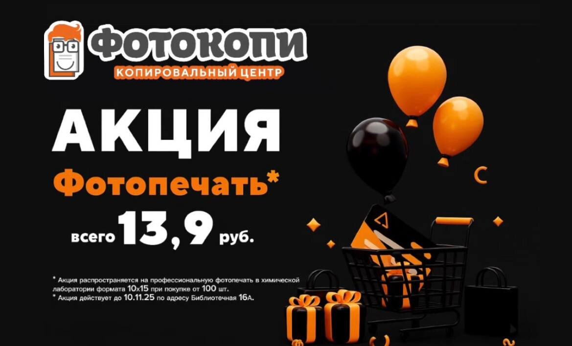Акция на фотопечать! Пора напечатать любимые кадры 📷 Только до 10 ноября фотопечать от 100 шт всего по 13,9 руб/шт, по адресу Библиотечная, 16А. Сохрани эмоции не только в телефоне ❤️ Печать фото -это лучший способ вернуть тёплые воспоминания к жизни. 👉 Успевай, до конца акции 13 дней! Контакты: 8-937-087-94-99 89370879499@mail.ru Пн - пт: с 08:30 до 19:00 сб: с 08:30 до 18:00 вс: с 10:00 до 18:00 Без перерыва