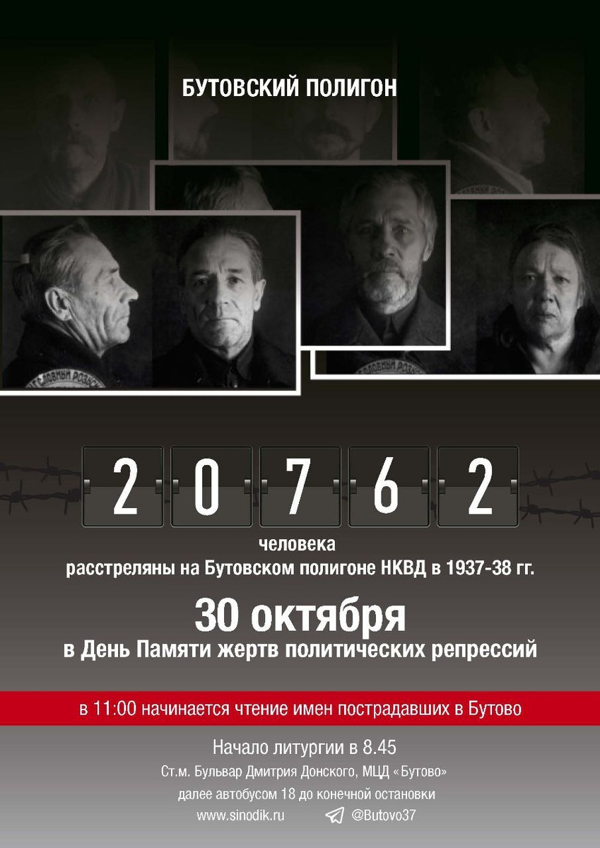 в) в храме на Бутовском полигоне, являющемся одним из центров хранения памяти как Новомучеников и исповедников Церкви Русской, так и всех, безвинно богоборцами убиенных или безвинно пребывавших в заключении, – Божественная Литургия и панихида (с сохранением сложившейся традиции внебогослужебной практики чтения на полигоне имен здесь убиенных);