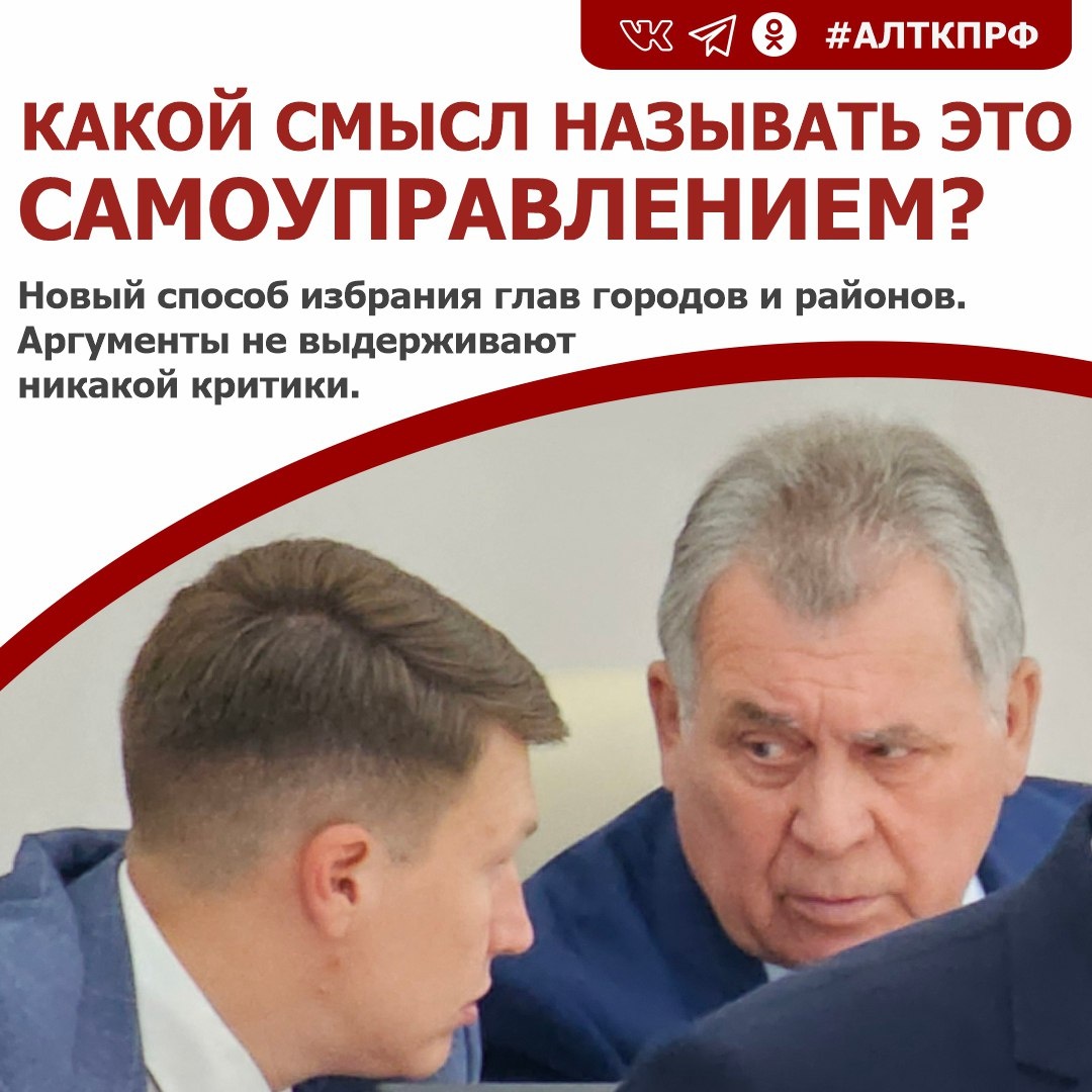 Какой смысл называть это самоуправлением? Новый способ избрания глав городов и районов: аргументы не выдерживают никакой критики. На 45-й сессии Алтайского краевого Законодательного Собрания, которая состоится уже завтра, 30 октября, будет рассмотрен ряд вопросов, касающихся реформирования местного самоуправления. Одно из ключевых предложений – изменить способ избрания глав городов и районов. Если сейчас муниципалитеты имеют право самим определяться как им выбрать руководителя местной администрации, то в будущем по предложению «Единой России» будет один способ – выбор главы местными депутатами из кандидатов, которых предложит губернатор. А глава региона, в свою очередь, будет определять круг кандидатов, из представленных ему партиями, Общественной палатой края и Советом муниципальных образований. Совет муниципальных образований состоит из… глав (!) или тех, кого глава назначит представлять его интересы в этом Совете. Кого они предложат губернатору в кандидаты? – вопрос риторический