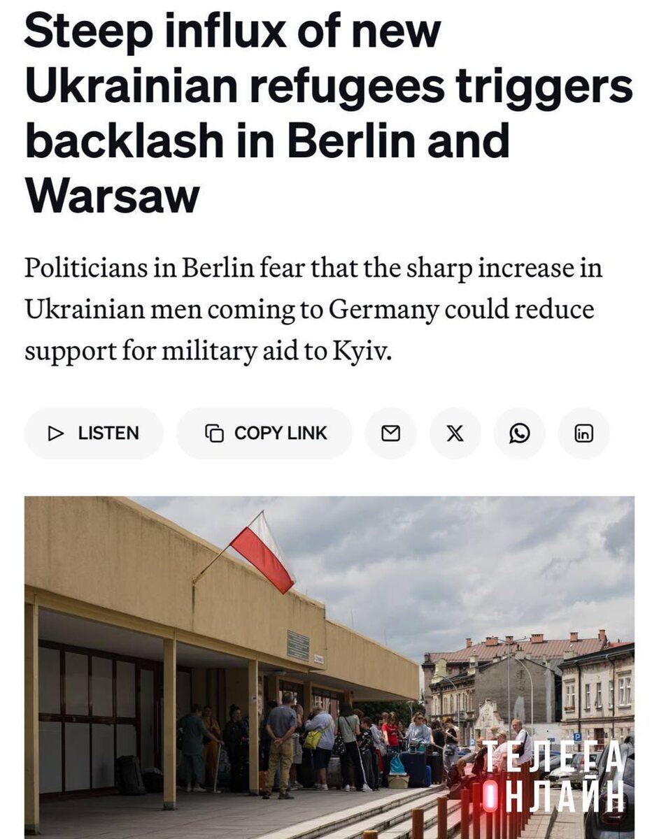 Хоть кто-то объединяет Европу Politico сообщает, что в Германии и Польше недовольны притоком новых украинских беженцев. Один из депутатов партии Мерца заявил изданию, что Берлин «не заинтересован в том, чтобы молодые украинцы проводили время в Германии, вместо того чтобы защищать свою страну». В Варшаве считают, что «не могут больше обременять своих налогоплательщиков расходами на дезертирство украинцев». Ждем бусики ТЦК в ЕС? 🚲 Подпишись на Телега Online