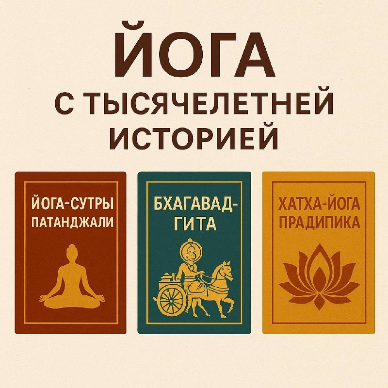 Книги с тысячелетней историей Приветствуем, друзья 👌 Йога - это не просто практика тела. Это путь познания себя, которому уже тысячи лет. Сегодня вспомним три великие книги, ставшие основой всей йогической традиции 📚 🟢«Йога-сутры Патанджали» Считается главным философским трудом о йоге. Здесь впервые описаны *восемь ступеней от этических принципов до состояния самадхи. Этот текст, как карта пути к внутренней свободе. 🟢«Бхагавад-гита» Беседа между Кришной и Арджуной о долге, выборе и смысле жизни. В ней йога раскрывается не как отдельная практика, а как образ жизни, путь осознанного действия. 🟢«Хатха-йога Прадипика» Практическое руководство по хатха-йоге. Здесь описаны асаны, пранаямы, мудры и работа с энергией, упоминаются энергетические каналы и чакры, основа того, что мы сегодня называем «физической практикой йоги» и «кундалини йоги». Эти книги помогают прикоснуться к корням традиции и понять, как глубоко йога связана с философией и внутренней дисциплиной. Пусть древняя му
