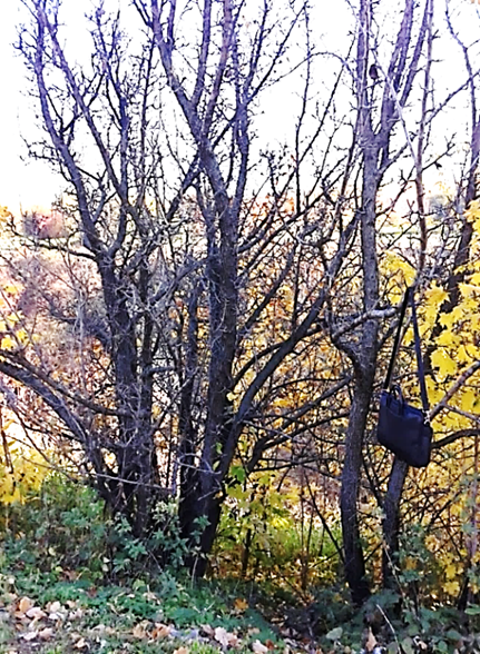 Справа на дереве висит мой портфель (для наглядности и подтверждения того, что это не мираж). На деревьях не было ни одной прямой ветки, каждый сучок слеплен вкривь и вкось из шариков и заканчивался почкой, напоминающей птичий коготь или жало скорпиона. Фото не способно передать, насколько жутко выглядело это неестественно чёрное, кривое дерево вблизи. Ни одного листочка я не нашёл ни на ветках, ни на земле и твёрдо решил наведаться на это место весной, чтобы изучить «объект» во время весеннего пробуждения.
