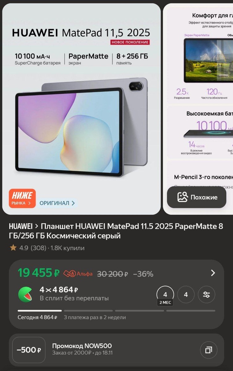 Планшет HUAWEI MatePad 11.5 2025 PaperMatte 8 ГБ/256 ГБ Космический серый за 19455₽