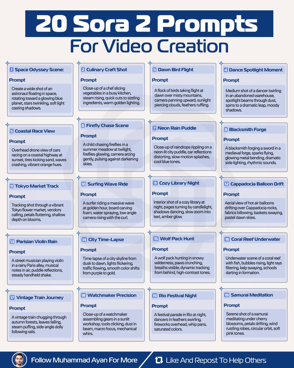 Энтузиасты собрали 20 промптов для Sora 2, которые заставляют нейросеть выдавать сцены, будто вытащенные из дорогих анимационных фильмов. Наслаждайтесь! Заходи в Телеграм, подписывайся на канал, там секреты, лайфхаки, хитрости для нейросетей 1. Space Odyssey Scene — astronaut floating in space, rotating toward a glowing blue planet, stars twinkling, soft shadows. 2. Culinary Craft Shot — close-up of a chef slicing vegetables in warm golden light, sizzling sounds, kitchen steam. 3. Dawn Bird Flight — a flock of birds takes flight at dawn over misty mountains, feathers glowing in sunlight. 4. Dance Spotlight Moment — dancer twirling in an abandoned warehouse, beams through dust, dramatic mood. 5. Coastal Race View — drone view of cars racing on a coastal highway at sunset, vibrant orange hues. 6. Firefly Chase Scene — child chasing fireflies in a summer meadow at twilight, pulsing lights, darkening skies. 7. Neon Rain Puddle — raindrops rippling in a neon-lit puddle, slow-motion splashe