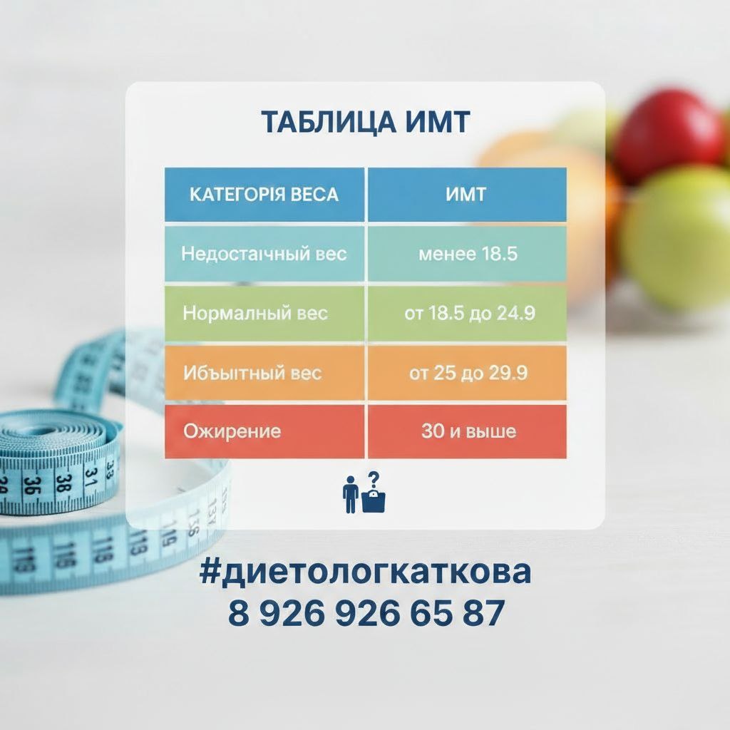 Индекс массы тела (ИМТ) — это показатель, который используется для оценки соотношения веса и роста человека. Он рассчитывается по формуле: ИМТ = (вес (кг))/(рост (м)²) ИМТ помогает определить, находится ли человек в пределах нормального веса, имеет избыточный вес или страдает от ожирения. Нормы ИМТ следующие: • Недостаточный вес: ИМТ менее 18.5 • Нормальный вес: ИМТ от 18.5 до 24.9 • Избыточный вес: ИМТ от 25 до 29.9 • Ожирение: ИМТ 30 и выше Знание своего ИМТ может быть полезным по нескольким причинам: 1. Оценка здоровья: ИМТ может служить индикатором риска развития различных заболеваний, таких как сердечно-сосудистые заболевания, диабет 2 типа и другие. 2. Контроль веса: Помогает отслеживать изменения в весе и определять необходимость коррекции питания или физической активности. 3. Планирование здоровья: Может быть полезен при составлении индивидуальных программ питания и тренировок. Однако стоит отметить, что ИМТ не учитывает состав тела (например, процент жира и мышечной ма